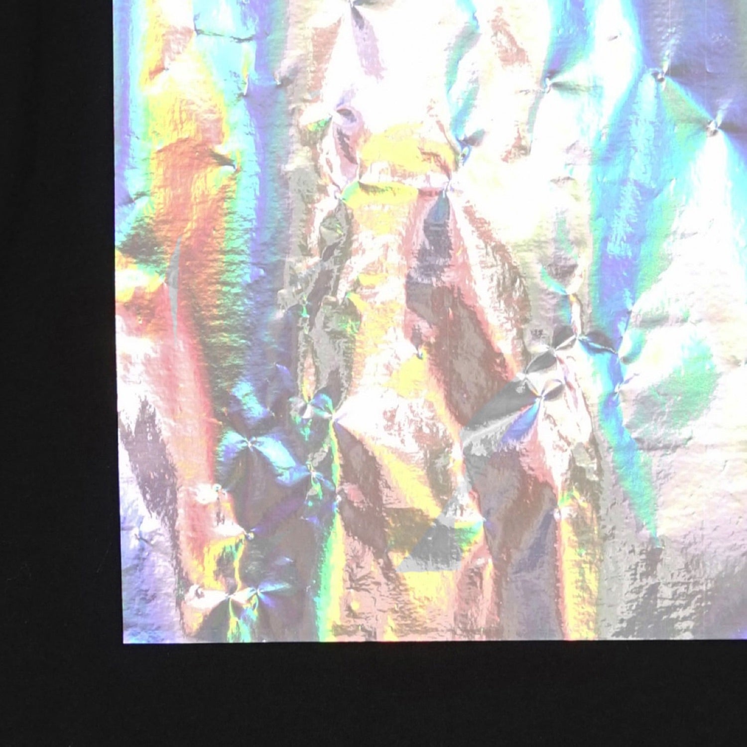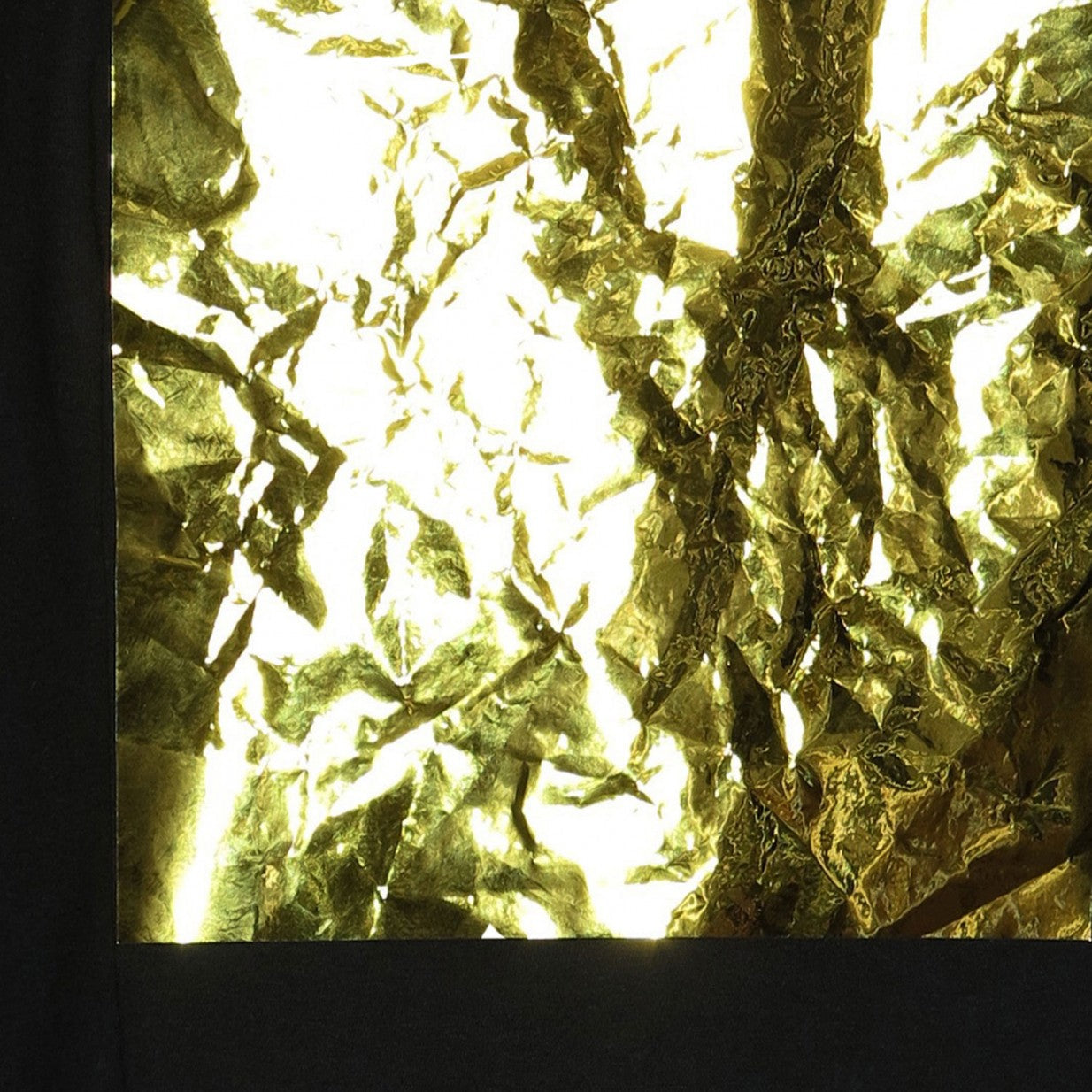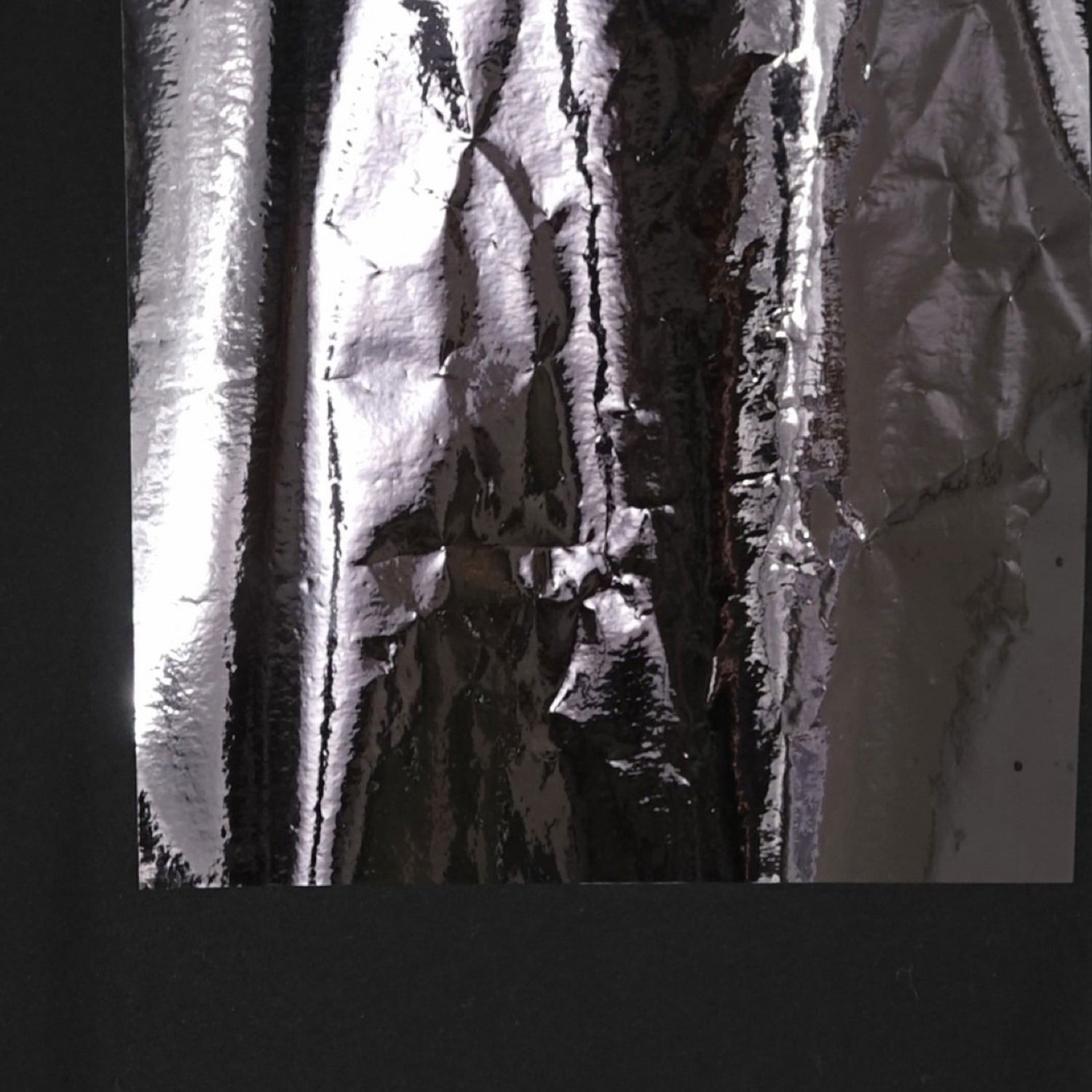 Der Print besteht aus einer speziellen Metallic-Folie mit vorgeknittertem Effekt. Durch das Tragen verändert sich die Oberfläche – wie bei einer Lieblingsjeans, die mit der Zeit ihre ganz persönliche Patina entwickelt. Jedes Stück wird dadurch zu einem unverwechselbaren Unikat.