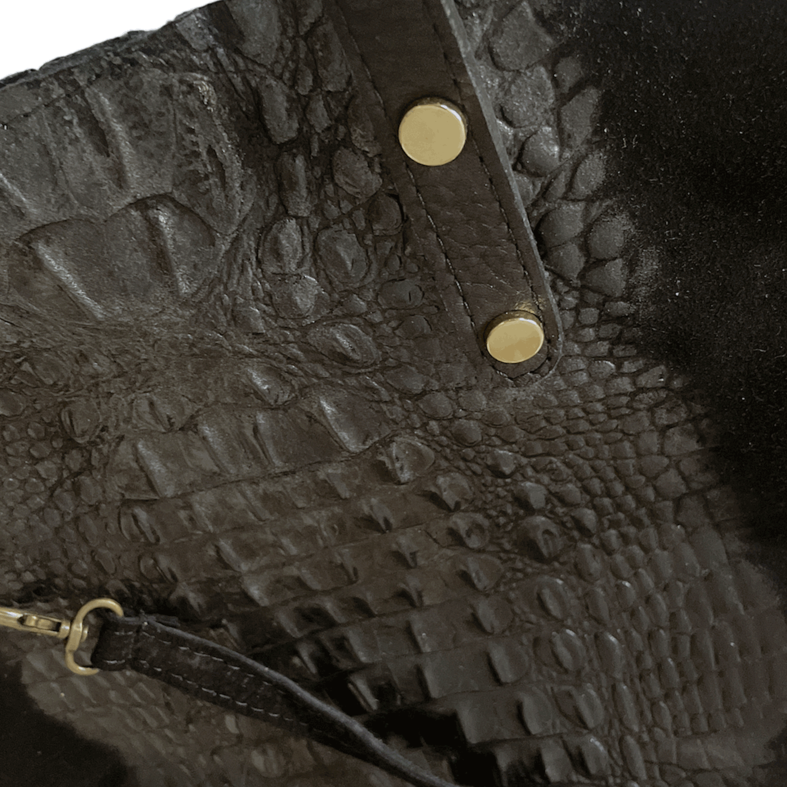 Unser Leder Beutel Tasche Krokooptik ist aus hochwertigem Veloursleder hergestellt und hat eine Breite von 37 cm und Höhe von 40 cm. Es schützt Ihre Gegenstände sicher mit seinem Futterlos made in Italy und seiner Extra-Innentasche. Mit seiner schönen Krokooptik (Prägung) in Schwarz ist es ein trendiges und zugleich zuverlässiges Accessoire.