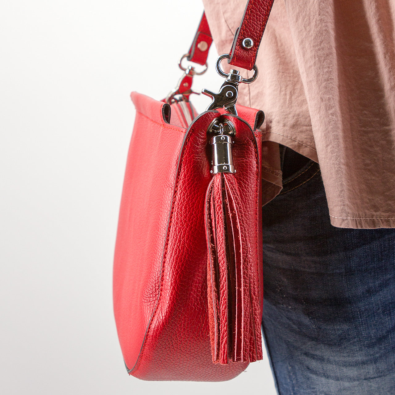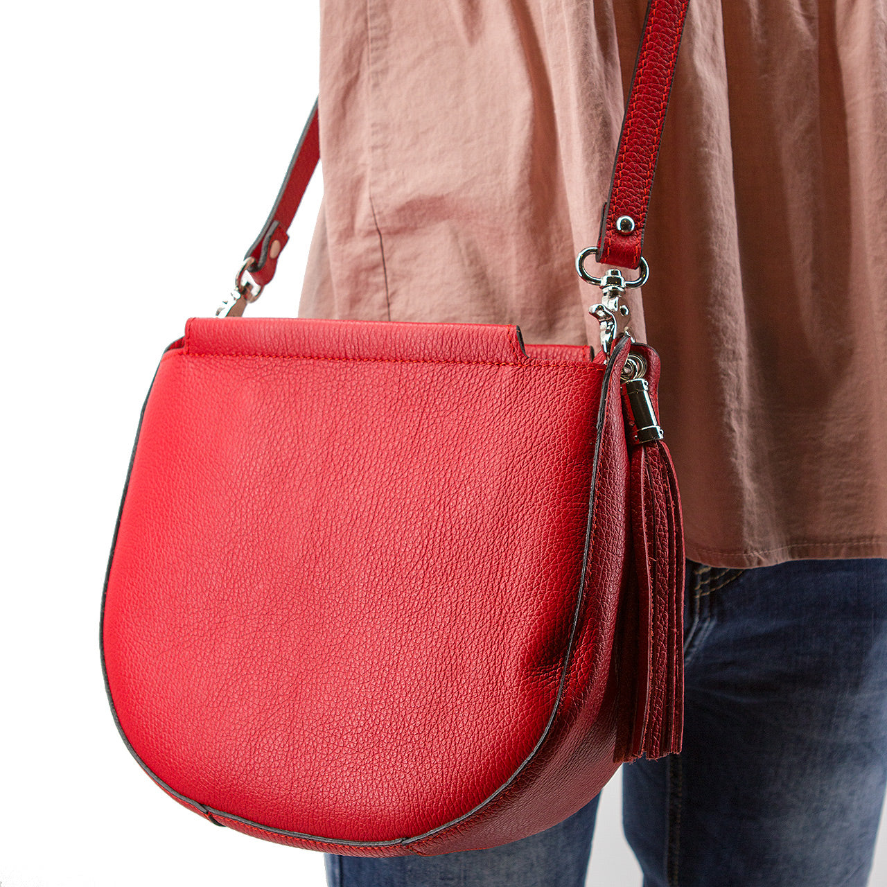 Modische Leder Tasche in D Form mit Quaste. Optional mit Blüten / Blumen Ledertragegurt - Siehe dazu die Bundle Angebote - Ein Großes Innenfach und eine seitliche Innentasche mit Reißverschluss, Tragegurt, Breite ca. 25 cm und Höhe ca. 23cm Tiefe ca. 9cm, Innenfutter 100% Polyester,